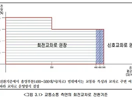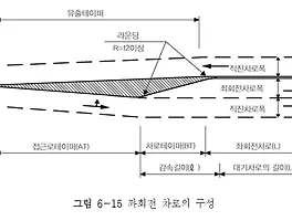 ■ 좌회전차로 설계▷개요- 평면교차로에서 좌회전차량의 대기행렬이 발생하여 통과교통과 간섭되는 경우 주행의 효율성과 안전성이 저하되므로 별도의 좌회전차로를 설치하는 것이 바람직하다.- 좌회전차로는 교통운영의 적정화, 용량의 유지, 추돌사고의 감소를 위해 직진차로와 독립적으로 설치(좌회전차량과 직진차량을 분리)해야 하며,- 좌회전 차량이 진입할 수 있는 충분한 시간적, 공간적 여유를 확보해야함 ▷설계기준- 좌회전 차로의 설계요소로는 폭원, 접근로 테이퍼, 차로 테이퍼, 유출테이퍼, 좌회전차로 등으로 구성 1) 차로폭- 좌회전차로의 폭은 3.0m 이상을 표준- 단, 대형차의 구성비가 작고, 용지 등의 제약이 심한 경우에는 2.75m까지 축소 가능 2) 접근로 테이터- 직진차량을 자연스럽게 우측 방향으로 유도하..